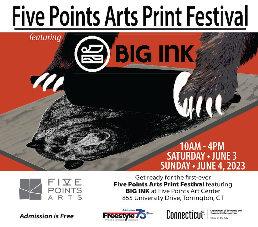 What started as an invitation to host BIG INK and a woodblock printmaking workshop at Five Points Arts has turned into the an print-oriented festival at its Arts Center in Torrington, Connecticut, June 3 and 4. If you have any interest in art of print making —or just like to be supportive of the arts in our community — you’ll want to be on the scene of the first-ever Five Points Arts Print Festival. The two-day event will be awash with activities centered around carved wood blocks, ink, and hand printing, along with lectures, demonstrations, art print sales, an art market and silent auction, plus music and food. Admission is free.