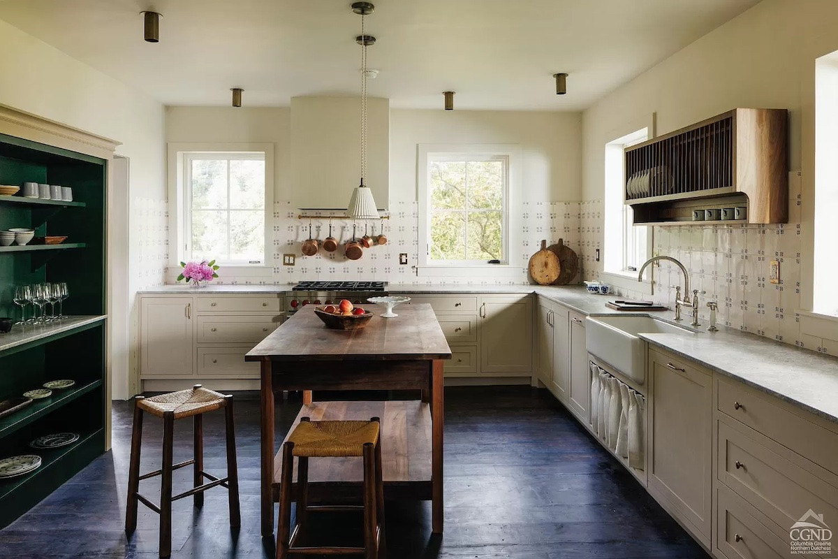 Built in 1940, this farmhouse is set back from the road down a long, circular driveway. Along with four bedrooms and four bathrooms, the interior offers a wide foyer, a designer kitchen, a dining room featuring a handpainted mural and a large living room with built-in cabinetry. In the backyard, a gunite saltwater pool overlooks a pond. Listed at $2,475,000 by Four Season's Sotheby's International Realty.