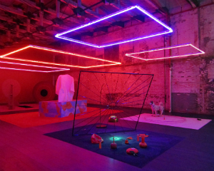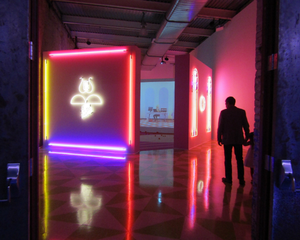 Amy Krzanik reports from North Adams. Another month, another chance to experience exceptional new art at MASS MoCA as the museum ramps up for its summer season. On Saturday, April 16, two exhibits shared an opening reception. Alex Da Corte’s Free Roses, comprised of sculptures, paintings and video installations, is the first museum survey for the Philadelphia-based artist. The neon-heavy exhibit features a selection of the artist’s work made over the last 10 years, as well as a large installation, "Lightning," created for the museum’s 100-foot-long, 30-foot-tall upstairs gallery. It’ll take a minute for your eyes to adjust to the dark gallery, where light comes only from neon squares hanging above skewered domestic vignettes set atop a rainbow of plush carpet squares. You’ll find plenty to ponder here, just don’t step on the rugs or pet the fake dog. You probably shouldn’t feed the fake swans, either. On the third floor, Sarah Crowner’s Beetle in the Leaves (her first solo exhibition in a U.S. museum), features the artist’s paintings, along with major tile works designed and fabricated for the show. Visitors are encouraged to step onto the raised tile floor — or dance floor, as one toddler imagined it to be — to get a closer look at the paintings that were made by sewing together pieces of canvas or linen. Both exhibits are up through the end of the year. Shown above, a partial view of "Lightning."