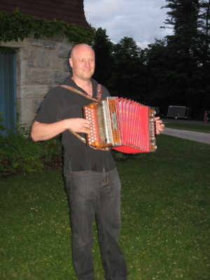 Photographer Kevin Sprague playing the accordion his grandfather brought from Slovenia; furniture designer Ruby Metzner and her daughter Kestrel Miro Duke.