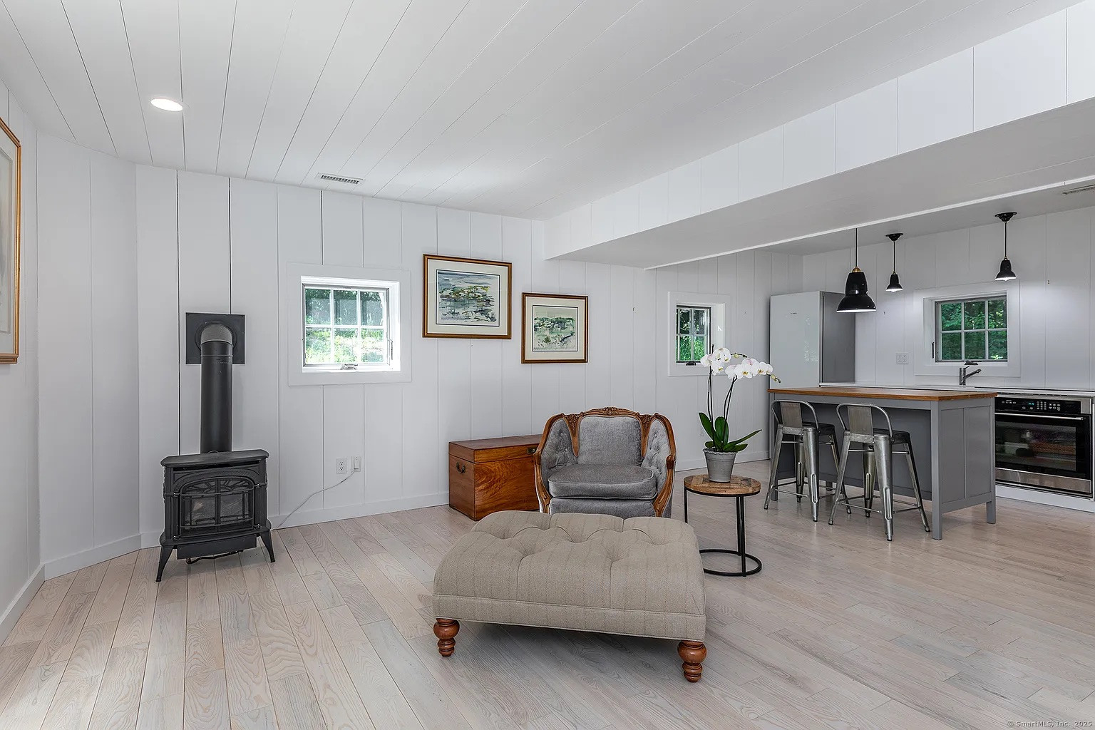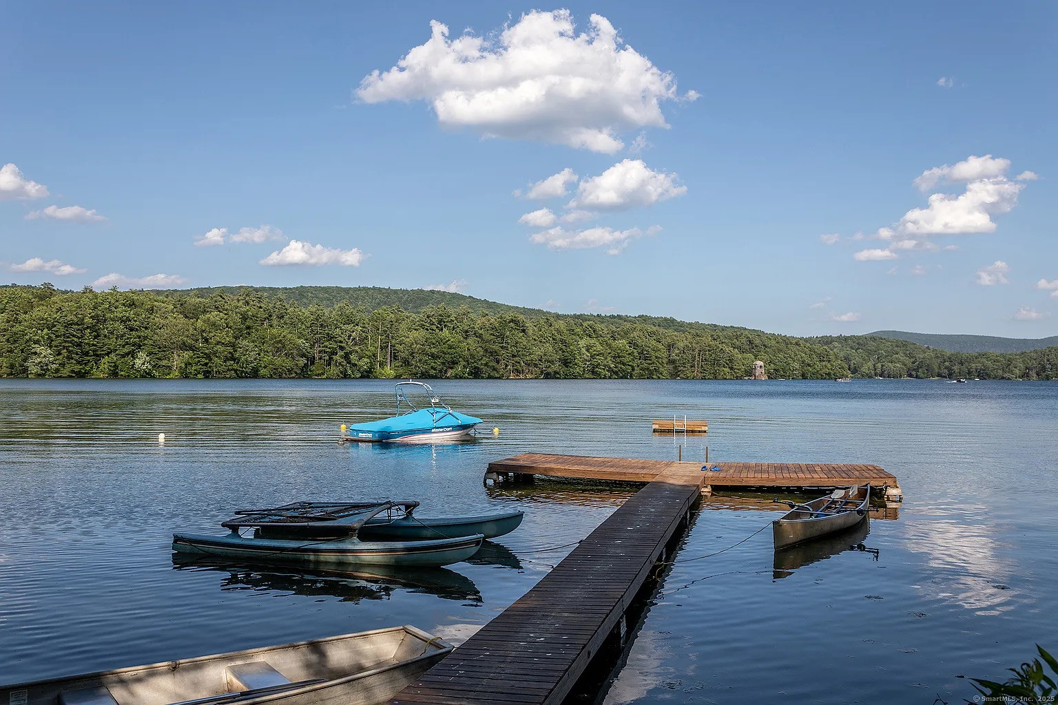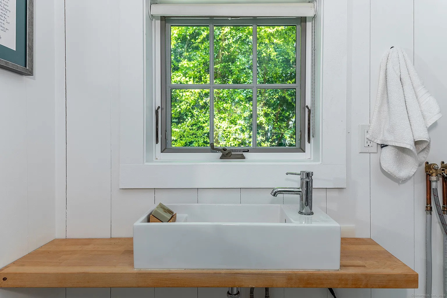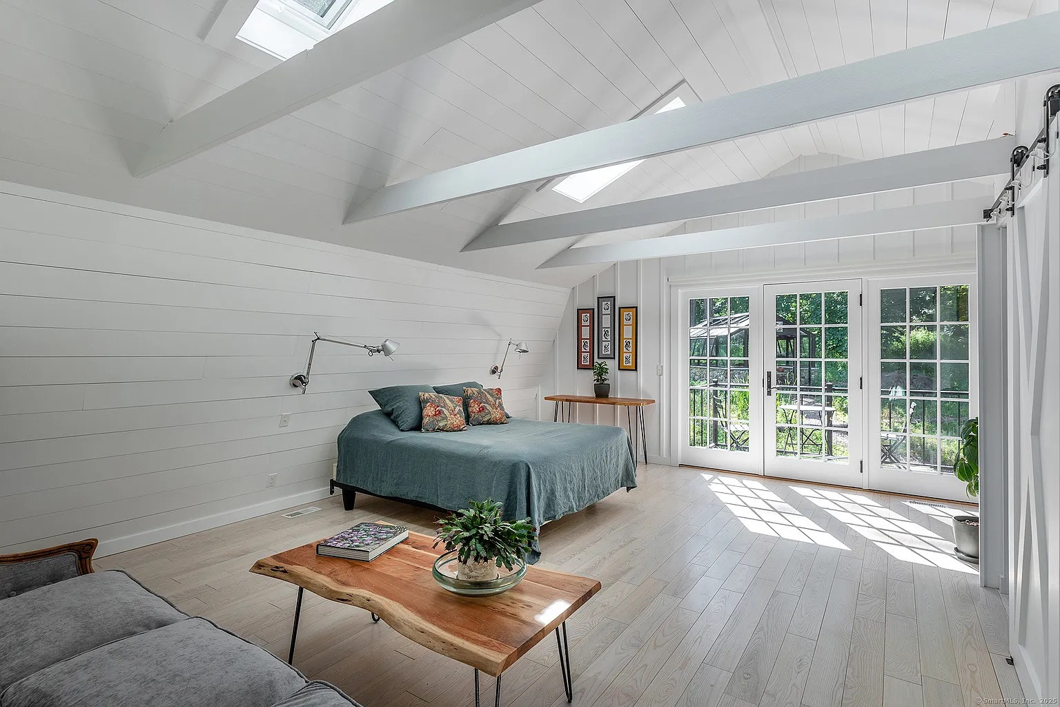 28 Rocky Lane in Salisbury is only around 1,000 square feet, with two bathrooms and just one bedroom, on 0.63 acres with a wildflower meadow and mini orchard. Inside, there’s central air and a generator for the whole house, French doors, and a fireplace; outside, the charm continues with an outdoor shower. There are water views and it’s easy to get into the lake for kayaking and boating.