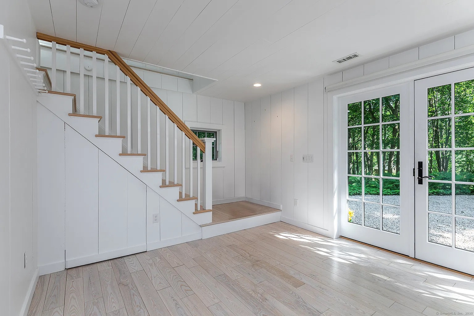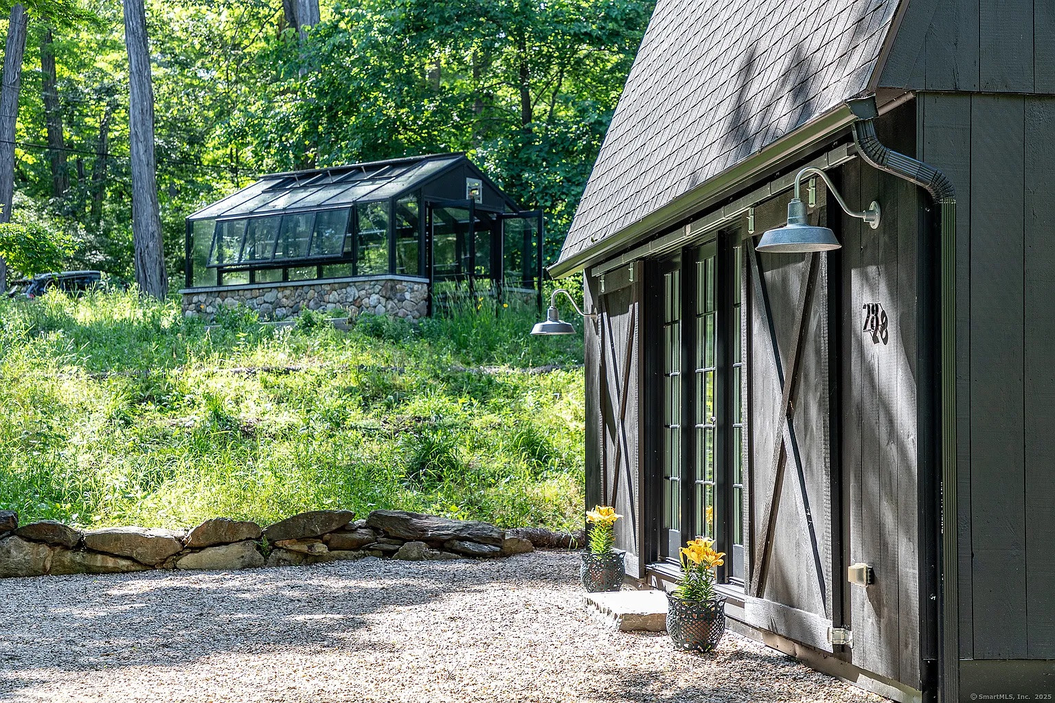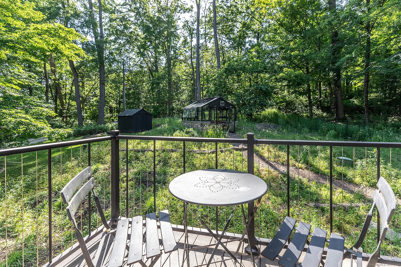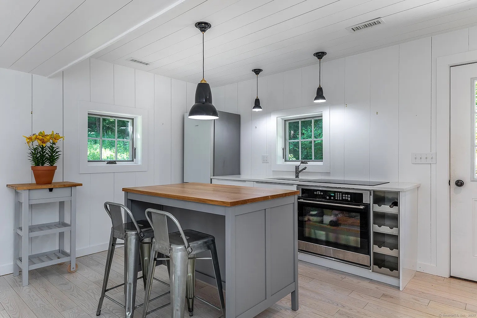 28 Rocky Lane in Salisbury is only around 1,000 square feet, with two bathrooms and just one bedroom, on 0.63 acres with a wildflower meadow and mini orchard. Inside, there’s central air and a generator for the whole house, French doors, and a fireplace; outside, the charm continues with an outdoor shower. There are water views and it’s easy to get into the lake for kayaking and boating.