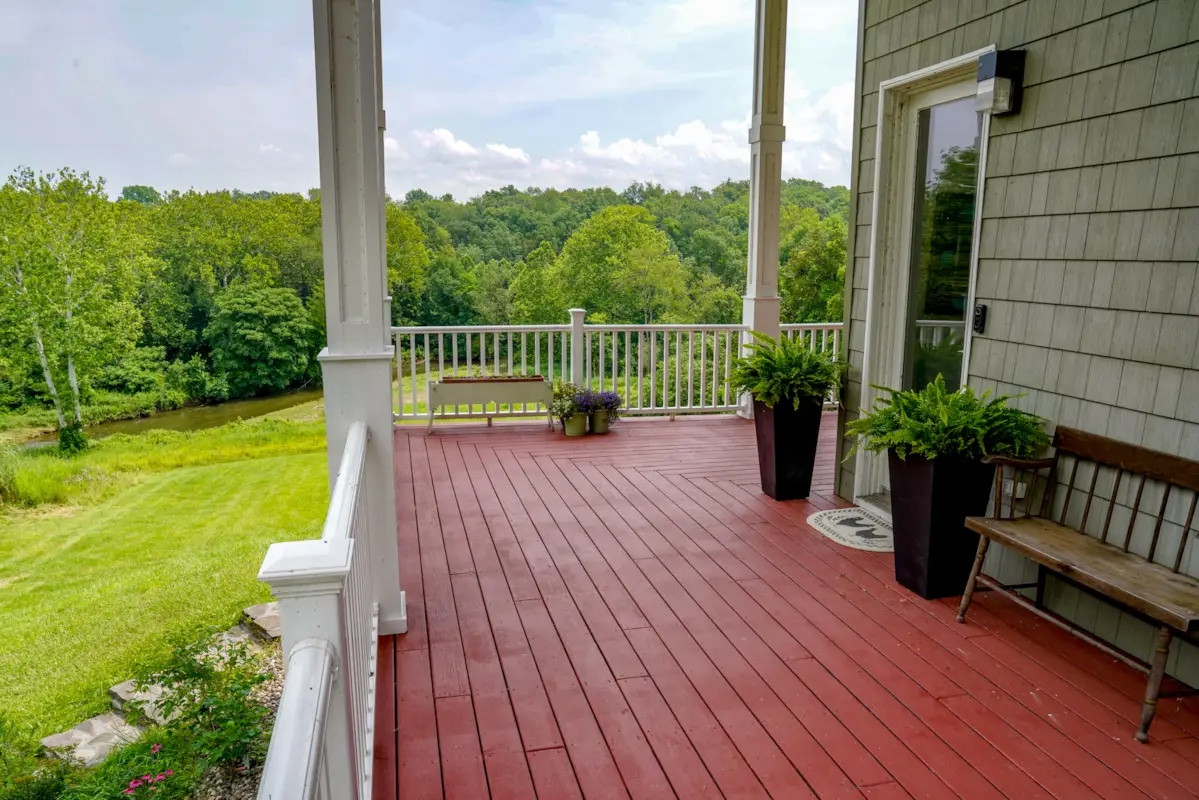 Situated in the hamlet of Germantown, this house offers 1700 feet of river frontage. The custom-built contemporary has five bedrooms and four bathrooms, an open concept layout and large windows. All rooms have access to the expansive wraparound deck. The River House also features Geothermal heating and air conditioning and state-of-the-art water purification system. A hot tub overlooks the Roe Jan River. Listed at $1,495,000 by Houlihan Lawrence.