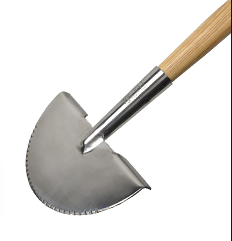 An indispensable digging tool, a Border Spade [right] (sometimes called a transplant spade), is unlike a typical flat spade in that it has a narrower head and a shorter handle. It's perfect for digging the planting holes without disturbing the other plants nearby. It makes it easier to lift root balls and clumps of bulbs located in tight spaces with precision, in order to divide or transplant. It also does double duty as a spot edger for keeping a clean line on beds. English toolmakers typically do a great job of producing this tool, with ash or oak handles and forged steel heads. Speaking of spades and clean lines, a Half Moon Spade [below] is the tool to have if you've got endless feet of beds to edge. Sharp bed and border edges can make even the most mediocre or unkempt garden look much nicer. It's also excellent for cleaning up the edges of walkways and patios that are raggedy looking because the grass has crept over the sides.