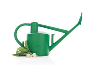 My favorite watering can by far is the Haws “Practican.” Engineered to be perfectly balanced, this lightweight but tough plastic 1.5-gallon can has a long spout for reaching into the root zone of pots to deliver water much less effortlessly than any other can I’ve experienced. It comes with two attachments, a brass rose and a downspout, and is brilliantly designed with two “parking places” for them on the can so they don’t get lost.