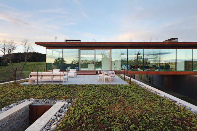 Planted green roofs on the home only add to this stealth effect. Not only do they help to reduce the home’s thermal gain and minimize rainwater runoff (“When the sun hits the plants, they just absorb the energy rather than it going into the house,” notes James), but they also act as a form of camouflage, lessening the home’s disturbance to the enveloping viewshed and by creating an effect that “helps the house blend into the landscape,” he says.