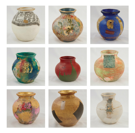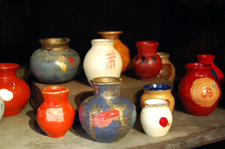 “The elements of human innovation, community, survival, and hope are implied in this collection," Walker says. “Human survival is no longer an individual crisis. The future of the planet itself has become a commonplace of international debate. The human community grows closer in the face of such a threat, and our survival will depend not only on cooperation and change but, to an even greater extent, on our struggle to become more conscious and generous, the aspirations of the sangha, the Buddhist devotional community." All told, the vessels range from crude to more refined, reflecting the diversity within a community. However they end up, they all start as simple, unglazed, earthen pots from Mexico, similar to the vessels made in rural cultures for centuries. Some get left partially raw, while others are highly saturated with pigment. Walker then embeds a fragment of a Tibetan prayer flag in the surface, a gesture that, according to artdaily.org, “evokes the long tradition in Tibet of making “treasure vases"--small decorated jars filled with talismans and sacred stones that are sealed and buried to bless and protect the earth and its beings--while simultaneously symbolizing spiritual generosity."