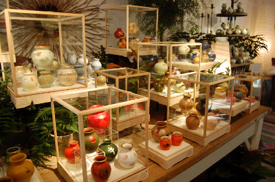 Because pottery has traditionally been used to save or store things, Walker feels her simple pots represent hope and the promise of tomorrow. “These jars, descended from ancient prototypes, carry ancient emblems. They stand in testimony to what has been achieved, what has been hoped for, and what may also be lost. They are at once spectators and votaries," she says. Part of the impact of the exhibit derives from the sheer number of vessels and the variety of their colors and finishes. It’s hard to resist touching them, although many guests didn’t repress this urge at Pergola’s opening party this past weekend, when lots of individual vessels and whole curated groups (vessel families, as it were) went happily to their new homes. Some collectors even asked Walker to bless and kiss them goodbye. Rod Pleasants, president of McIver Morgan Interior Design and Architecture, bought three vessels, each with a subtle celadon glaze. He plans on keeping one, and giving the other two as gifts. “Walker works in a wide range of color and style," he says. “The vessels move from very subtle matte finishes to vibrant intense color--not many artists are capable of that."