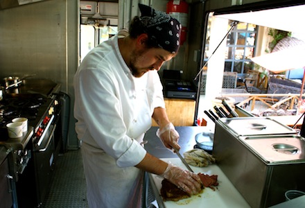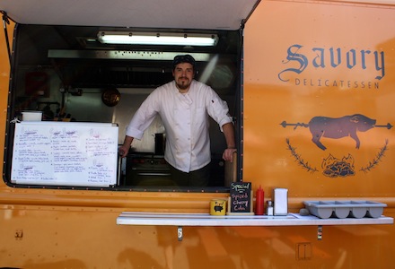 Gracie’s, helmed by chef Andrew Speilberg and baker/pastry chef Allyson Merritt (they're partners in business as well as in life), is focusing on preparing perfect fast food-style burgers, fries and doughnuts. Everything is made entirely from scratch with the highest quality, locally sourced ingredients. Mike Freeman, only a few feet away in the bright orange Savory truck, is putting out deli staples like a pastrami on rye with meat cured, brined, smoked and prepared over an 11-day process. “It’s tedious but it’s worth it," Freeman says of making the pastrami, which shares the menu with homemade smoked ham and turkey as well as a slow-cooked porchetta that just falls apart. “I sometimes think of it as an Italian pulled pork."