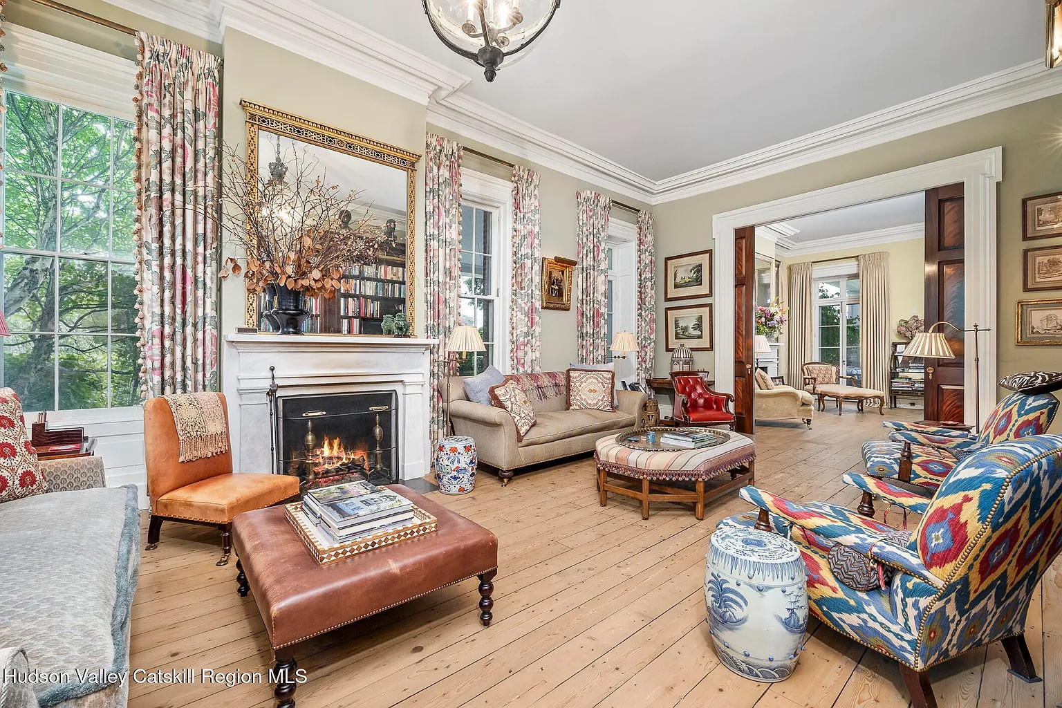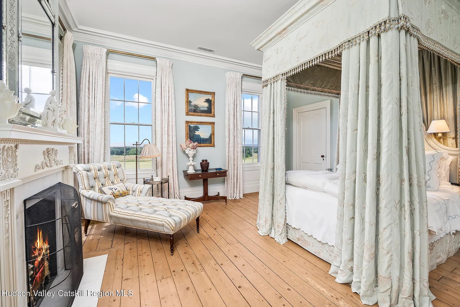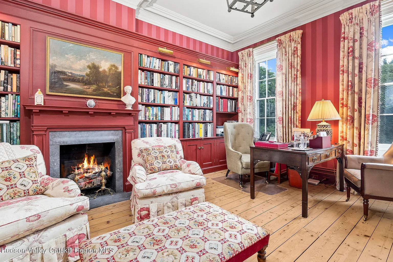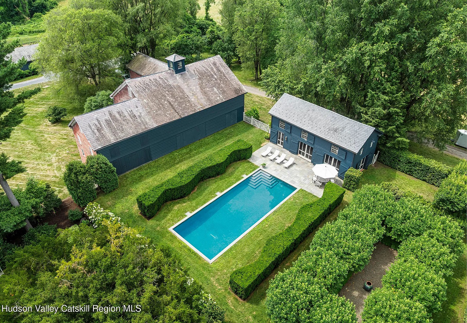 Outside, the aforementioned gardens plus a 35-zone irrigation system surround the pool, pavilion, and many outbuildings including a poolhouse. This is a mansion aficionado’s dream, and it’s in Kinderhook, close to all the great art, food and culture in Columbia County.