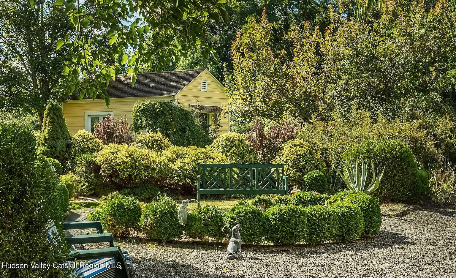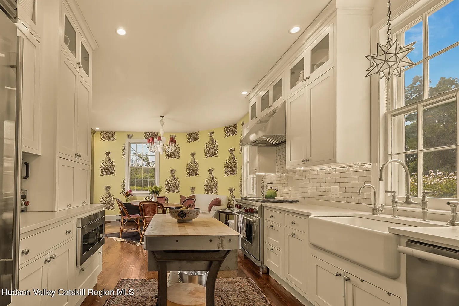 There’s a barn and a lovely garden cabin, and the main house has 4,320 square feet and four bedrooms and five bathrooms. The kitchen is renovated with new designer appliances, and the bedrooms and bathrooms have been updated but still match the house’s aesthetic.
