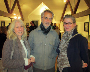 Scott Baldinger reports from Hudson. Landscape designer and professor David Dew Bruner and realtor/antiques dealer Jonathan Hallam, partners in life, kept separate identities as antiques, art, and design retailers on Hudson's Warren Street. Bruner had his eponymous store on the bustling 600 block and Hallam's was formerly in the relatively quiet 400 one. They decided to join forces a bit off the beaten path, way up on Columbia Street (across from Columbia Memorial Hospital) in the carriage house of a vacant 1910 Beaux Arts Victorian mansion, rumored to have once been built for an Astor and last used as a funeral parlor. The newly opened Hallam+Bruner is located in a stunning space, and opening night on Saturday, February 16, brought a crowd as lofty as the wooden rafters dramatically framing the antiques and art on view (drawings by Bruner, sculpture by Ben Bishop). At left: guests Logan Goodman, renown stage and screen actor David Strathairn, and jewelry artist Gabrielle Kiss.