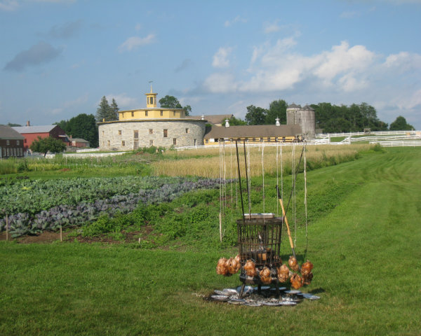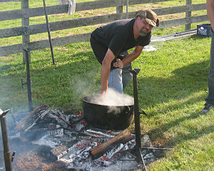 Jay Galarneau from Fire Roasted Catering stirs the foraged mushroom and farro risotto in the 200-year-old caudron; Lee Blatt, Sydelle Blatt, Randy Nelson and Cynthia Nelson.