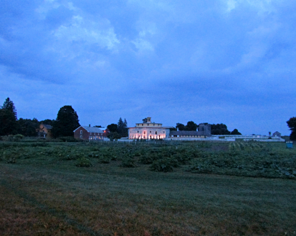 The 1826 Round Stone Barn glows in the blue twilight of the evening.