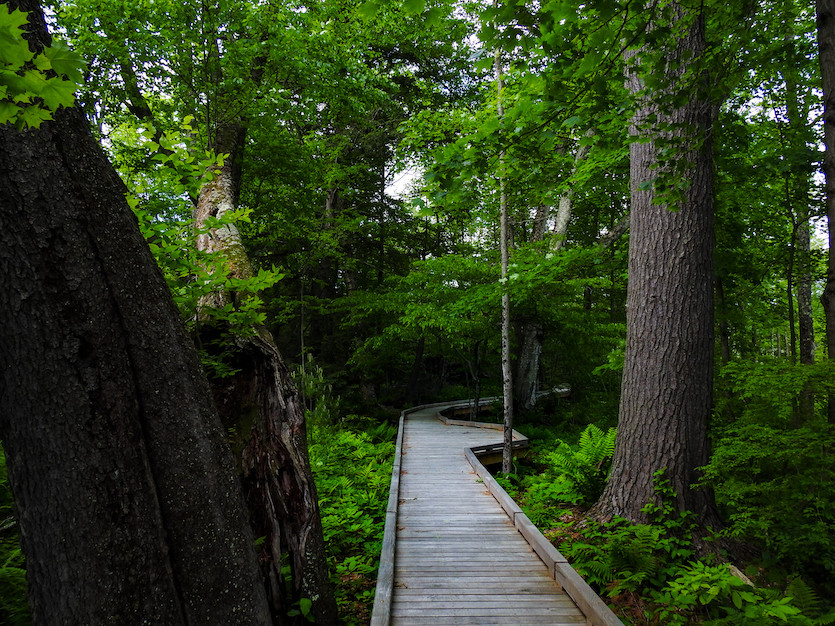 Not everyone wants, or is able, to clamber over rocks and roots at the top of a mountain. One of BNRC's most beloved trails is its shortest, easiest hike: the accessible boardwalk at Parsons Marsh. It's a spectacular site for birding — ospreys nest there and in the spring, the warblers are everywhere. From the parking lot, visitors walk a hard-packed path through a meadow carpeted with native wildflowers. From there, the boardwalk winds into the forested wetland, with benches at the halfway point and the end.