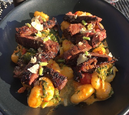 To start, the Santa Fe clam chowder ($6) is a savory departure from the typical Manhattan variety. Spices associated with Southwestern cooking give the chowder a spicy bouquet that supports the fresh ingredients. Two salad standouts, each with a secret ingredient are the Mediterranean salad and the panzanella salad (both $12). They are amply sized to be full meals and are certainly large enough to share as a first course. During the growing season, the herb garden that occupies a space of honor in the rooftop dining area yields mint, pineapple sage, oregano, thyme, cilantro, rosemary, various flavorful peppers and cherry tomatoes. Salads feature these “just picked” accents as long as the frost holds off and the garden can thrive.