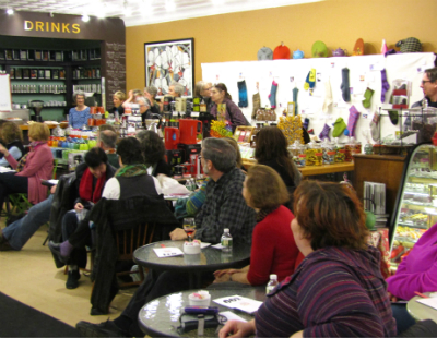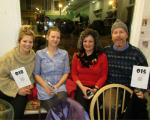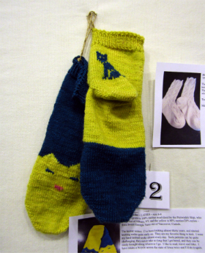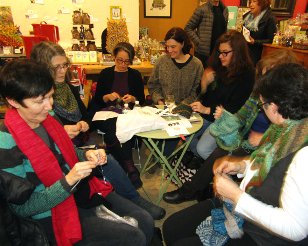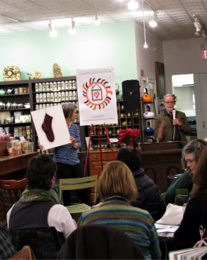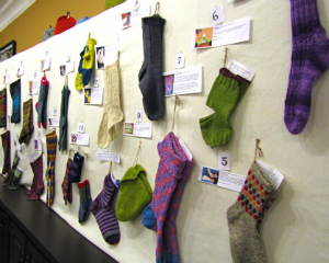 Amy Krzanik reports from Hudson. More than 80 knitters and bidders crowded into Verdigris Tea & Chocolate on Warren Street for the very first Charity Sock Auction on Saturday evening, Feb. 18. The event, sponsored by Countrywool and Neighborhood Knitters of Hudson, was an ingenious way to supply neighbors with warm winter socks, which are a much-needed but rarely donated charity item. The live auction, led by Rupert Fennell, raised more than $3,000, which will be donated to The Salvation Army of Hudson to purchase thermal wool socks. Each of the 34 donated hand-knit sock pairs – which ranged from men’s striped to women’s silk to children’s booties – included a gift certificate stuffed inside, provided by one of 30 local businesses, making this a true community-wide effort and allowing even non-knitters a chance to participate. To add a little drama to the already brisk bidding action, one pair contained a $100 bill generously donated by one of the knitters.