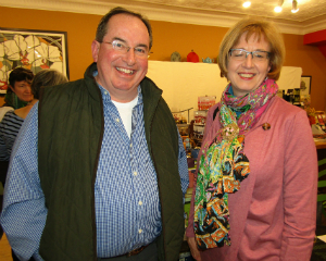 Bob Weinman and Carol Doerfer of the Salvation Army Advisory Board; a sample of the 34 warm and colorful lots up for bidding.