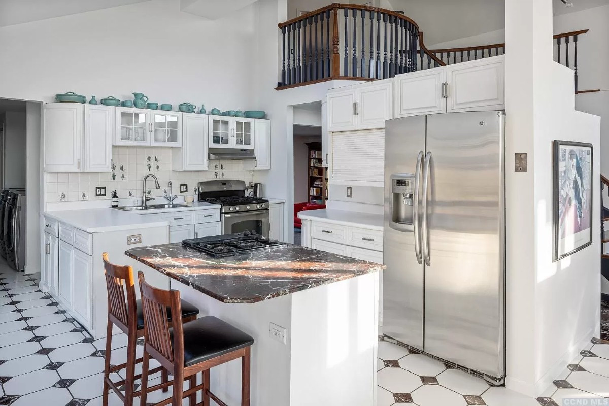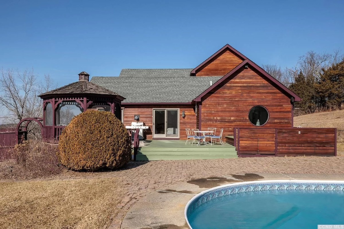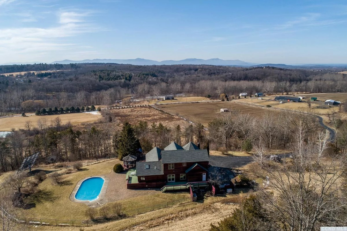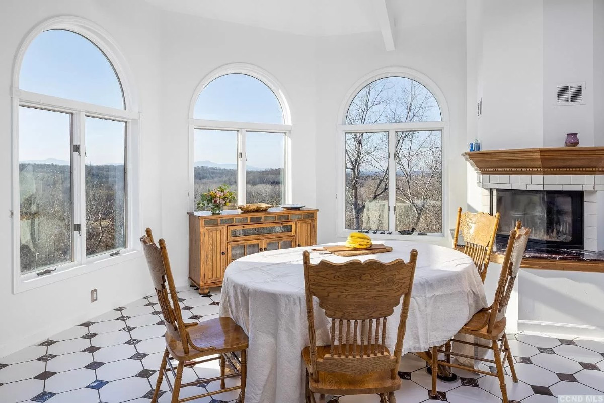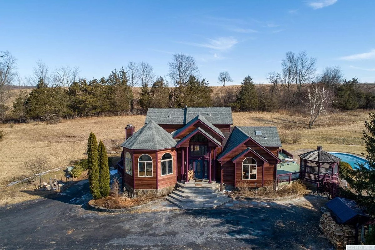 Sunsets over the Catskill range are a feature of this Contemporary in Craryville. It offers a double-story entryway and an open layout, and three bedrooms and four bathrooms. Other amenities include a saltwater pool, radiant floor heating, solar, sauna, and a finished basement. Take in views from two balconies, a deck and patio. Listed at $1,085,000 by Four Seasons Sotheby's International Realty.