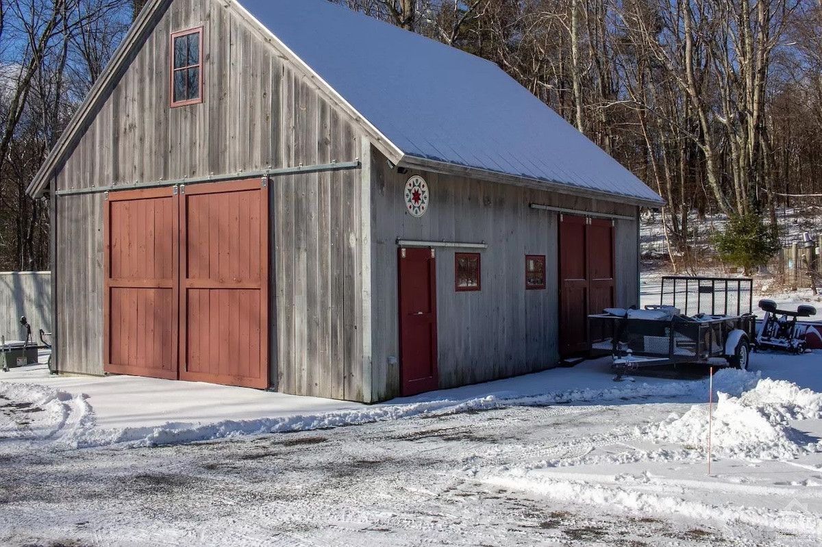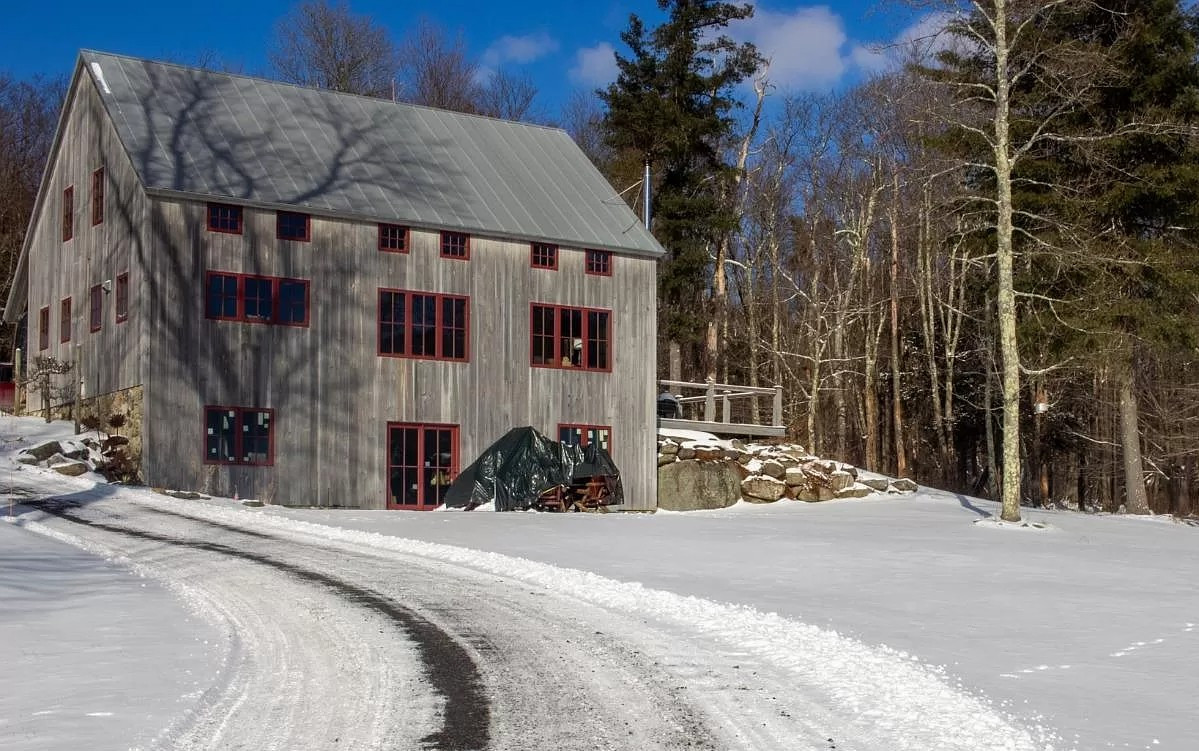 A post-and-beam home built in 2012 features wideboard pine floors, high ceilings and a kitchen overlooking the swimming pond and fields. There are three bedrooms and two bathrooms,a wood stove, and walkout lower level with radiant heat. There's also a separate garage with full attic space, as well as a chicken coop and vegetable gardens. Listed at $995,000 by Gabel Real Estate.