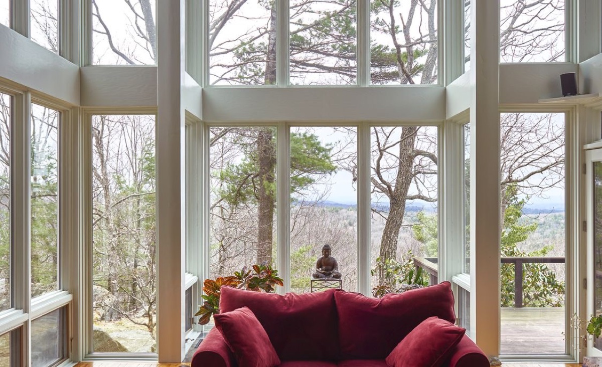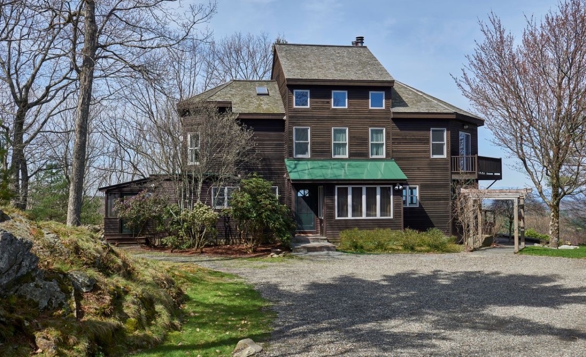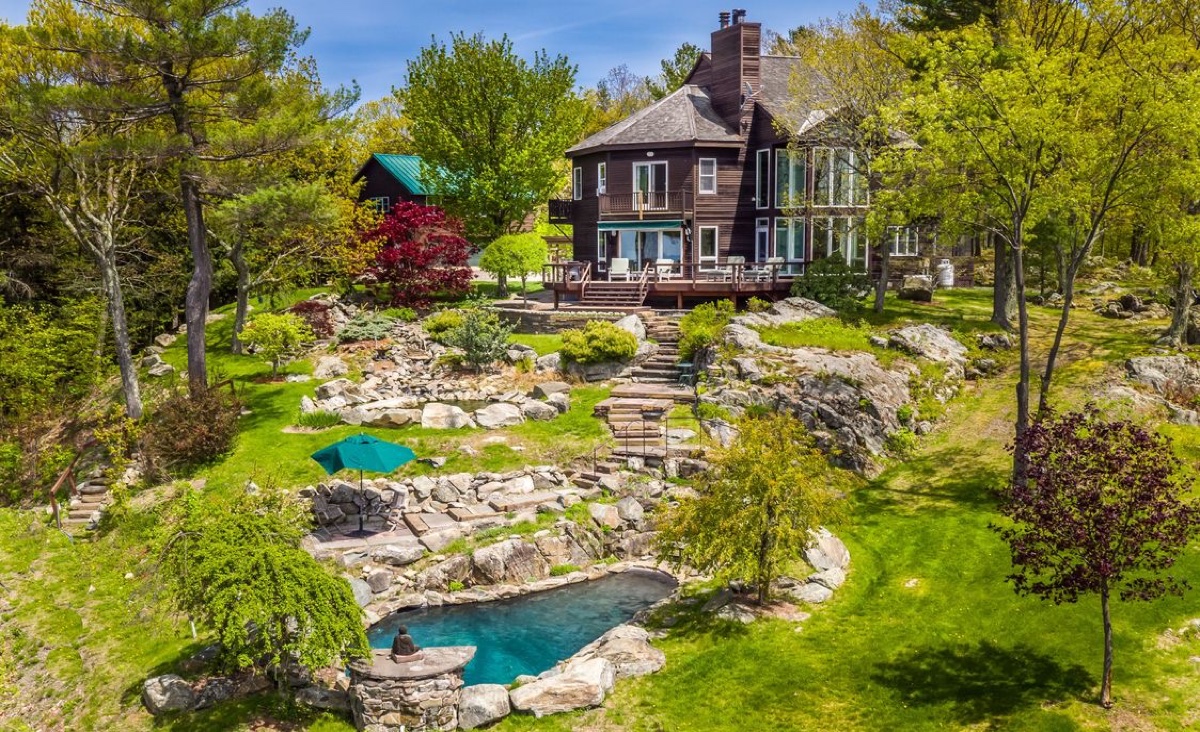 With 4 bedrooms and three-and-a-half baths, this contemporary home sits on 28 hilltop acres in Canaan with a backdrop of the Catskill Mountains. The first-floor great room has a two-story glass window that frames the view and features a fieldstone fireplace, and an updated kitchen. Upstairs is the master suite, which has its own screened porch, and an office/den. A separate three-car garage has an open studio and bath. Among the outside features are a waterfall and koi pond. Listed at $875,000 by Houlihan Lawrence.
