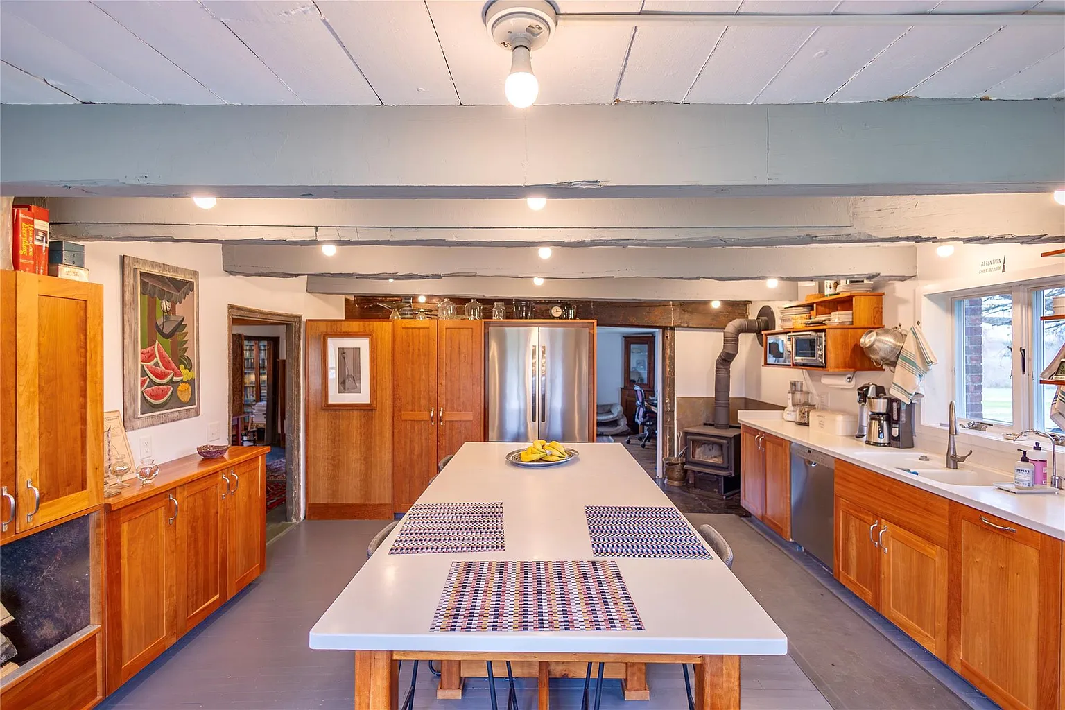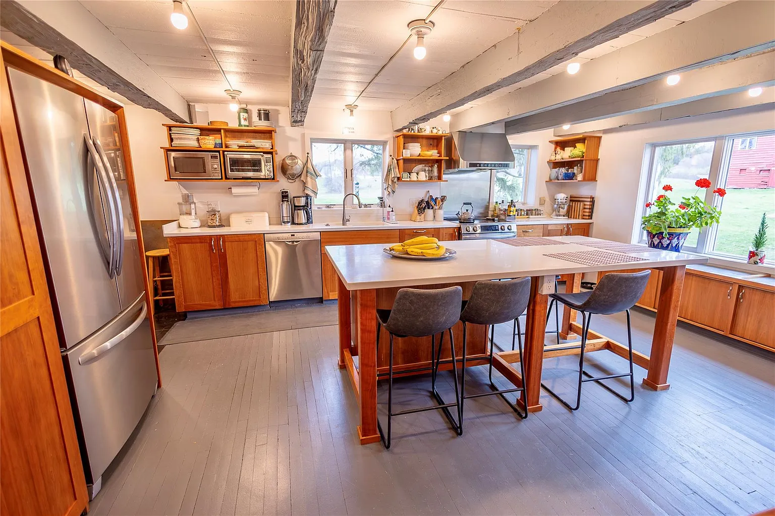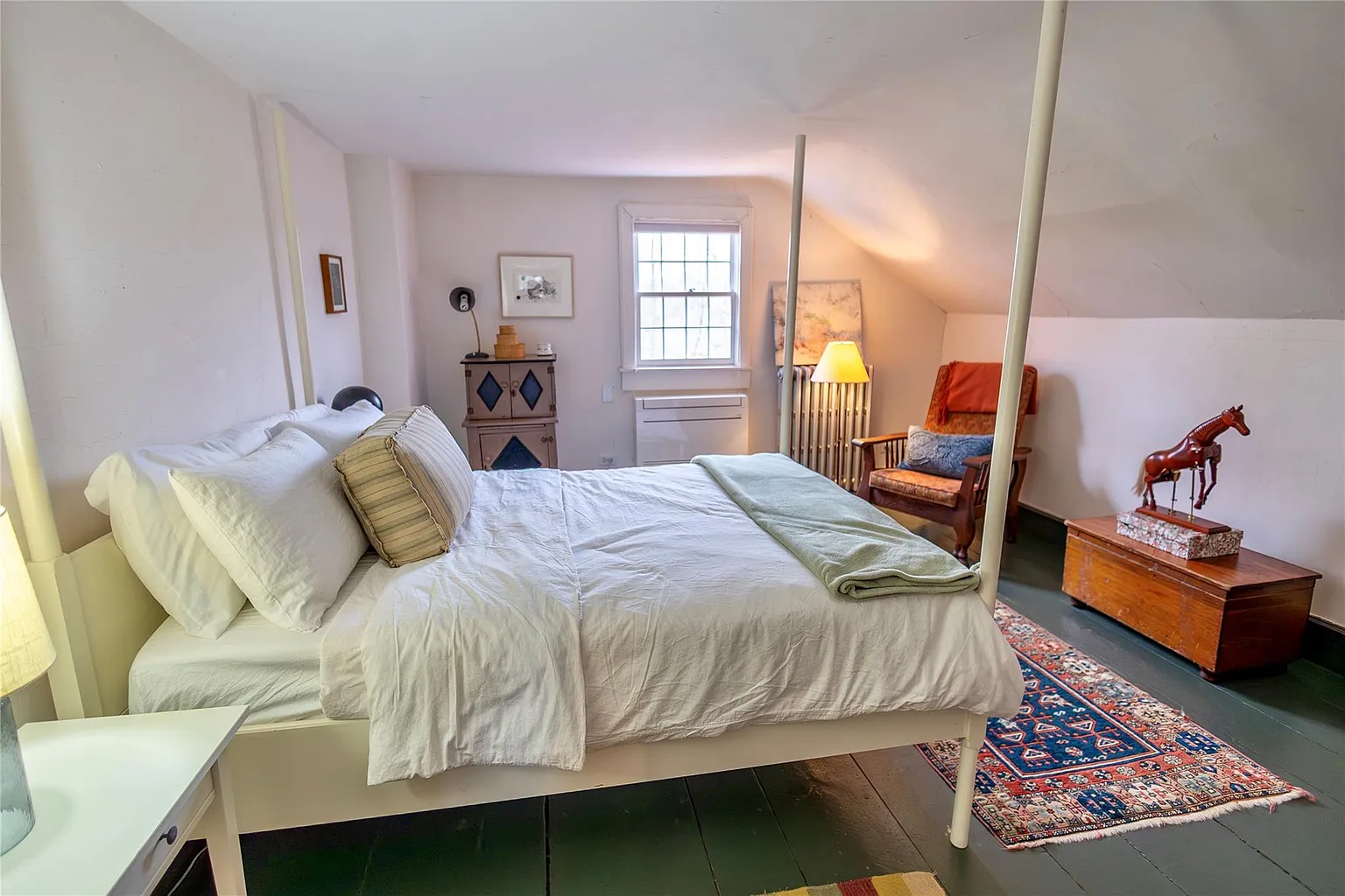 The best of both worlds are here for those who appreciate a historic home but want to live a sustainable 21st-century life: wide-board floors, hand-hewn beams, and built-in bookshelves alongside modern comforts like heat pumps in every room, a $60,000 solar array with powerwalls, and two Level 2 EV chargers. Inside the 2,200-square-foot home are four bedrooms and a spa-like upstairs bathrom. A three-story barn is nearby, with 200-amp service, an artist's studio, and buried power lines.