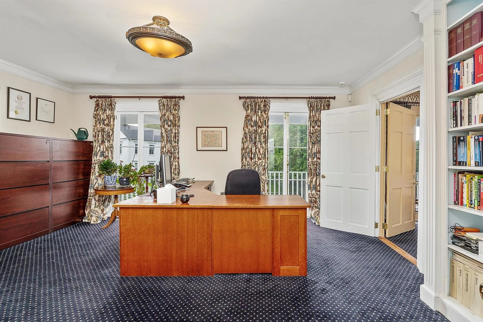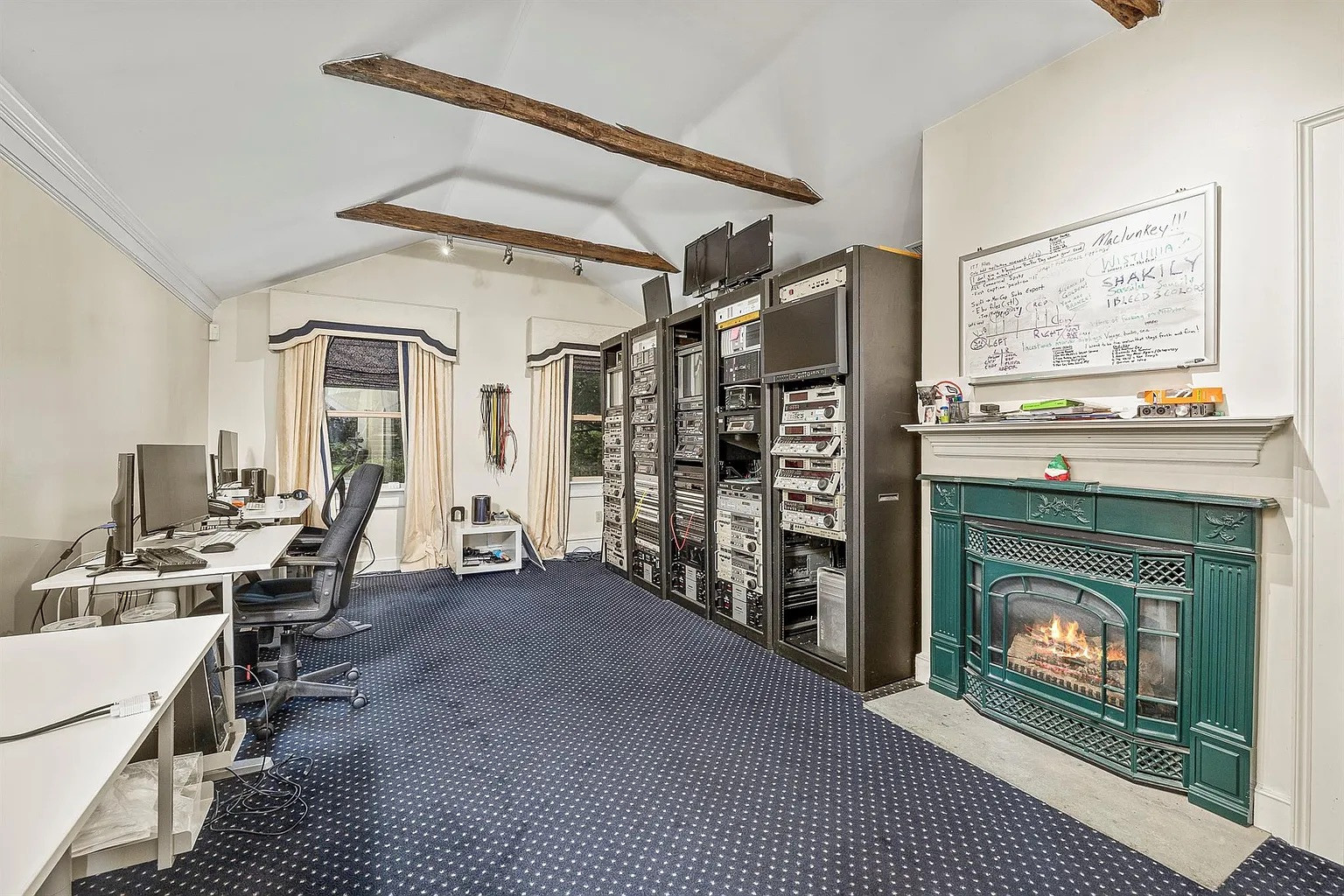 There are five "suites" with bathrooms inside, currently staged as office and living space. This place has a lot of potential for almost any kind of use—it could be a great apartment or condo property, or an artist residency, or a weird gallery...the list goes on. It's got two fireplaces, crown moldings, high ceilings, and a balcony on the second story (with double wraparound decking outside on the house's facade), and a custom gym. There's a beautiful stone patio outside, and the house is on a modest half-acre.