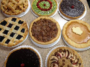 at A-Frame BakerySharon Sutter pats dough filled with chocolate chips into a baking pan. She's preparing for the holidays in the efficient purple triangle of the A-Frame Bakery in Williamstown. For Sutter, Thanksgiving means pie — apple, pumpkin, cranberry and blueberry, pecan, maple apple mincemeat — as well as tarts, pumpkin rolls, cheesecake with cranberry pear conserve... the list goes on. As the holidays go on, too, she'll make Hanukkah treats, often for families wanting to send a holiday memory to students away from home. Christmas brings cakes, she says — yule logs (bûches de noel) filled and frosted with chocolate and decorated meringue mushrooms, decadent tortes, red velvet. People also come in for baked goods for breakfast: crumb cakes, scones, muffins and quick breads. Anyone wanting a large order should call ahead, though. She makes all of her baked goods fresh daily, and plans carefully so as not to have much left over, but will willingly adapt for anyone who gives her enough time. The bakery is strictly kosher, and Sutter can make non-dairy or gluten-free treats if asked. 1194 Cold Spring Road, Route 7, Williamstown, MA (413) 458-3600 Filling in the Corners