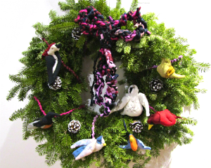 One of the kissing balls, decorated with paper stars; Carrie Jean Converse's wreath featured colorful birds.