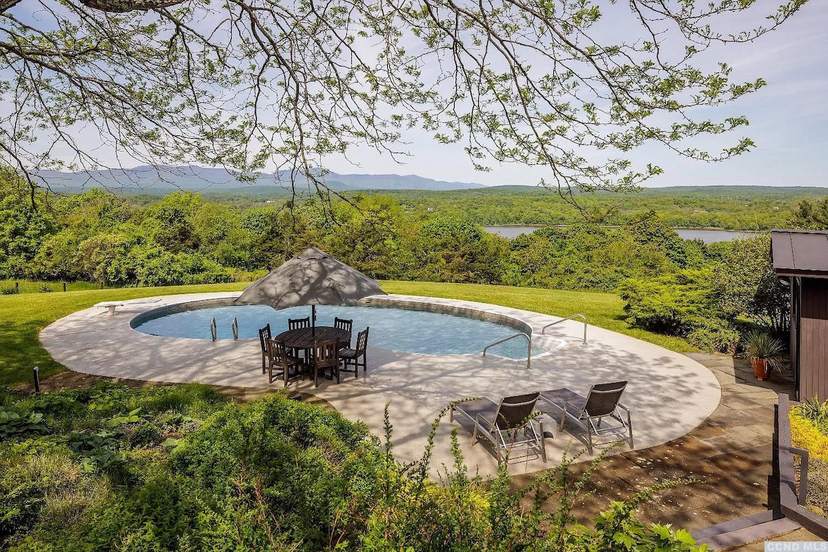 This Hudson home, built in 1978, is located in the Mt. Merino hilltop neighborhood overlooking Hudson as well as the river. Features include a sunken living room, three fireplaces, 14-foot pitched ceilings, and walls of glass. There are four bedrooms and four bathrooms, two home offices, a screened porch, a pool, and attached two-car garage. Listed at $2,595,000 by Four Seasons Sotheby's International Realty.