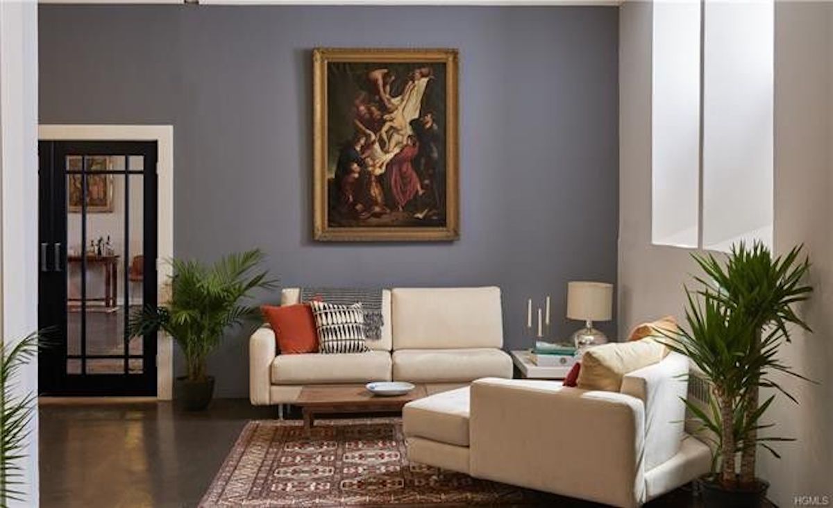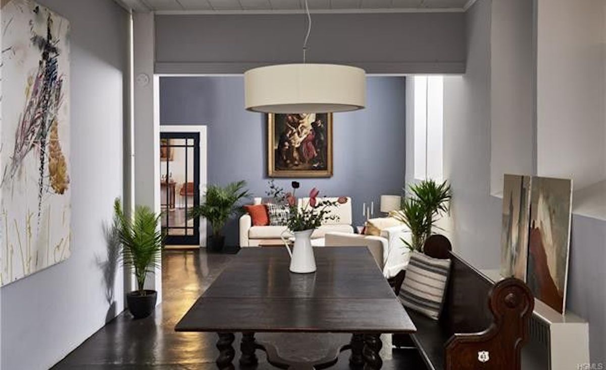 Built in 1869, this historic German Lutheran Church in Hudson was adapted for use as a recording studio with residential space in 2008. Among many architectural details is beautiful hardwood flooring, moldings, stained glass windows, ornate lighting, and endless nooks and crannies. A winding staircase leads to the choir loft and continues up into the large spire where the church bell used to hang. The lower floor is currently used for both live and workspace and is outfitted with a large, open living/kitchen area, two sizable bedrooms, a bathroom, and an open lounge/dining area. The building, situated in the center of town, also features a number of upgrades suited to a multitude of commercial or private uses. Listed for $1.425 million by Douglas Elliman.