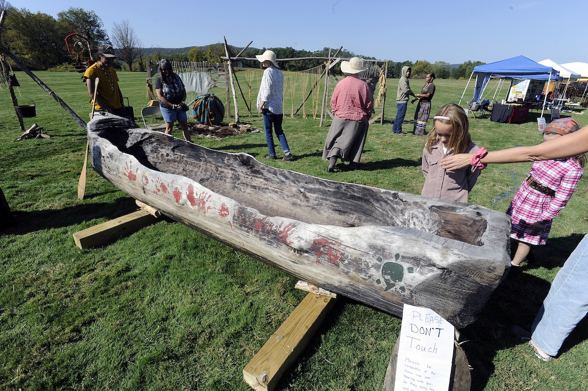 A dugout canoe made of a large white pine log on display. Miguel Wandering Turtle Walks With No Fear, a member of the Nipmuc Tribe, says it took seven people seven days to make the boat, a yearly tradition.