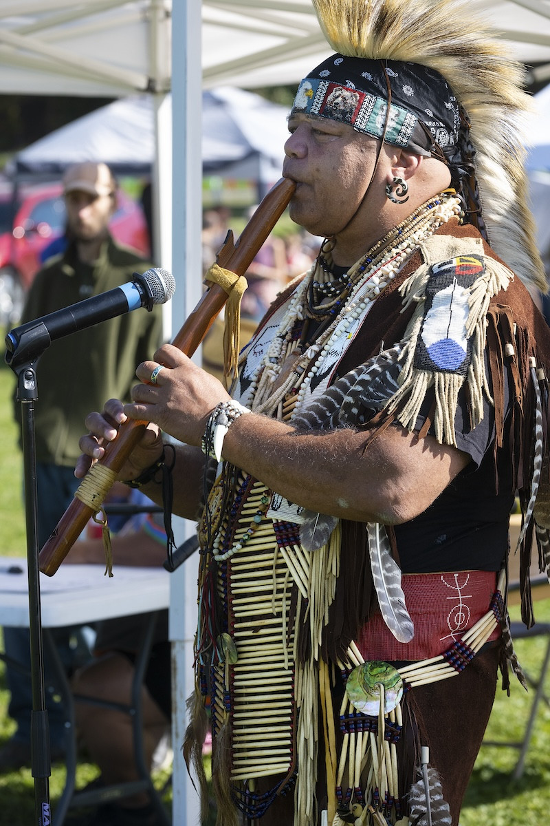 Homelands PowWow organizing board member Shawn Stevens plays the flute.