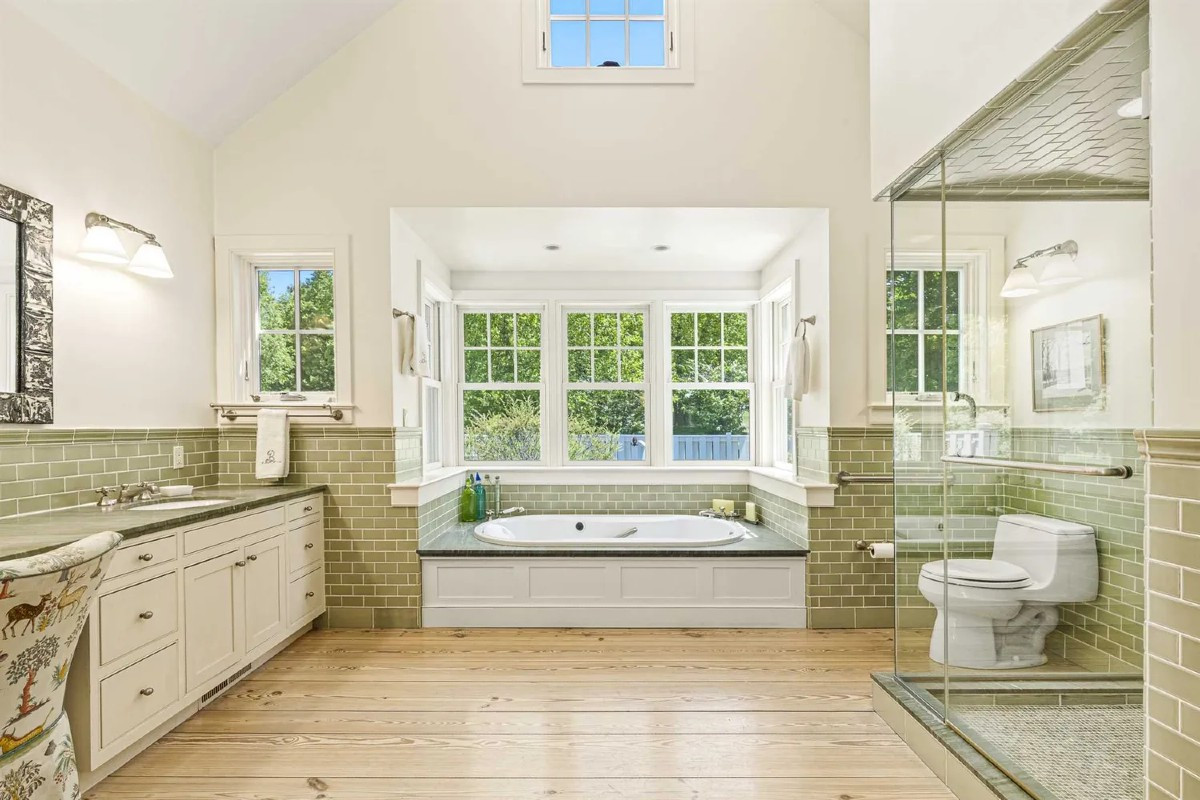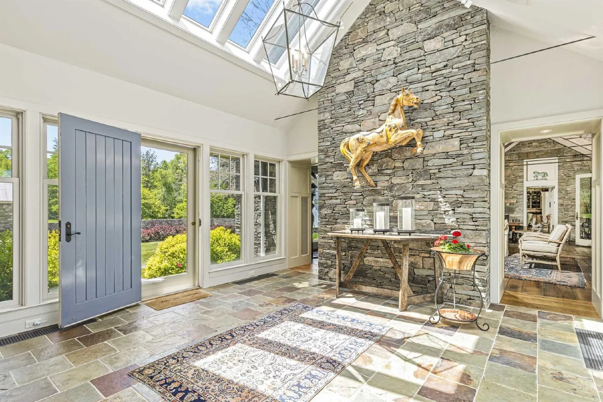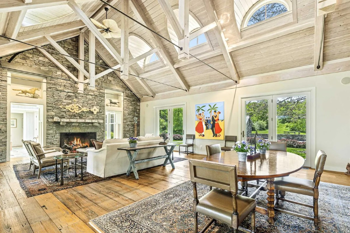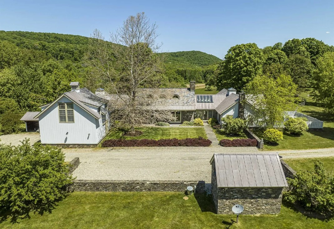 Set on 126 acres in Pine Plains and surrounded by protected conservation easements, this home, built in 2005, offers three bedrooms and five bathrooms. A driveway edged with stone walls winds past meadows. There are skylights and floor-to-ceiling windows, hardwood floorboards, and fireplaces. A private garden with a hot tub turns the primary suite into a retreat. The house includes a finished basement with many possibilities. Listed at $4,500,000 by Compass.