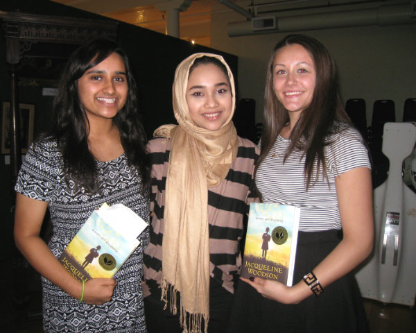 Atia Begh, Ramisa Tasnim and Brittany Varriale, students from Hudson High, read passages aloud from "Brown Girl Dreaming," whose award-winning author, Jacqueline Woodson, will appear at the Festival.