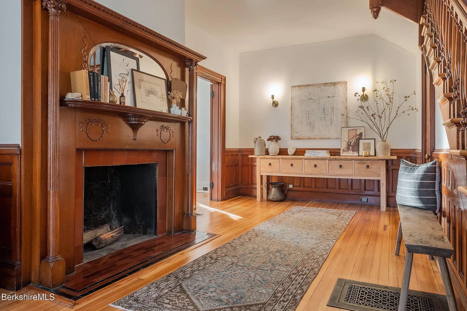 At 4,100 square feet, it’s on a corner lot walkable to downtown Great Barrington, with the bonus of a private backyard space. There’s a high-ceilinged entry foyer, original fireplace, and lots of unspoiled original woodwork, from a double-width staircase to boxy paneling in the common rooms downstairs to raised rings of flowers on one of the fireplaces.