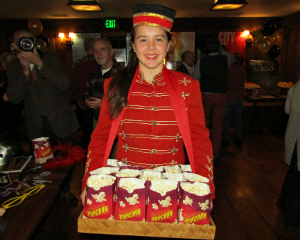 Amy Krzanik reports from Williamstown. On November 30, 1916, Walden Theatre on Spring Street in Williamstown screened its very first film, a William S. Hart western called The Patriot. One hundred years later, the oldest movie theater in New England, now known as Images Cinema, is still going strong. To mark this momentous anniversary, guests gathered just a couple of blocks down the street, at The Log, on Friday, Nov. 11 to celebrate with past and present Images board members and staff, film fans and other supporters from the Northern Berkshire community. Attendees were encouraged to dress as their favorite movie characters, pose in the photo booth, and dance to the sounds of DJ Hush. Executive director Doug Jones and board president Sam Crane spoke of highlights from the theater’s distant past (popcorn wasn’t served in the early days of screenings, as that would have been too loud, distracting and seen as “beneath” the theater-going experience), its recent past (in 1989, a group that included actor Christopher Reeve raised funds to save the theater) and its future (Images, now a nonprofit, hopes to raise $100,000 during its 100th birthday year.) [Above: popcorn girl Charlotte Sanford.]