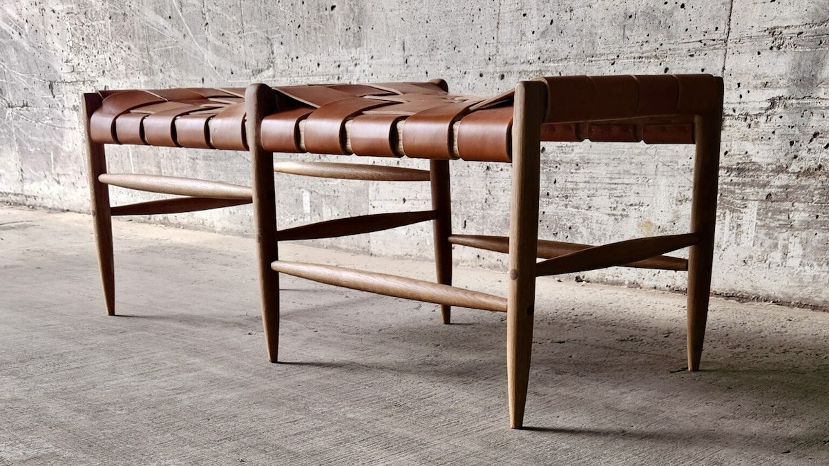 This keen eye for color extends to complementary materials. Sling arm chairs put leather from a boutique Hudson Valley tannery to good use; ditto for the Windham bench and barstool, a pair of newish additions to the line. Further visual interest blooms by way of a floral design gracing cutting boards and other vessels—an effect that uses resist liquid to create a negative image that retains the wood’s original color in concert with food-safe reaction finish that ebonizes the exposed wood. Painter Kiernan Pazdar, who is also Shippee’s spouse, works from the studio above and is a frequent collaborator when it comes to such artistic endeavors.