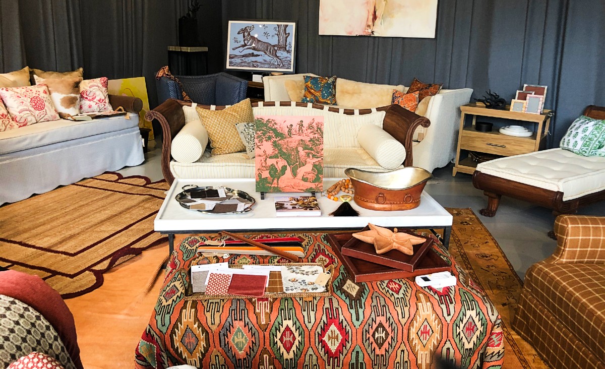 All of the furniture is his own design The sofas are down filled and upholstered in fabrics from iconic European mills. He is the exclusive dealer for Holland & Sherry, Rogers & Goffigon,and Bennison Fabrics, all high-end textile makers.