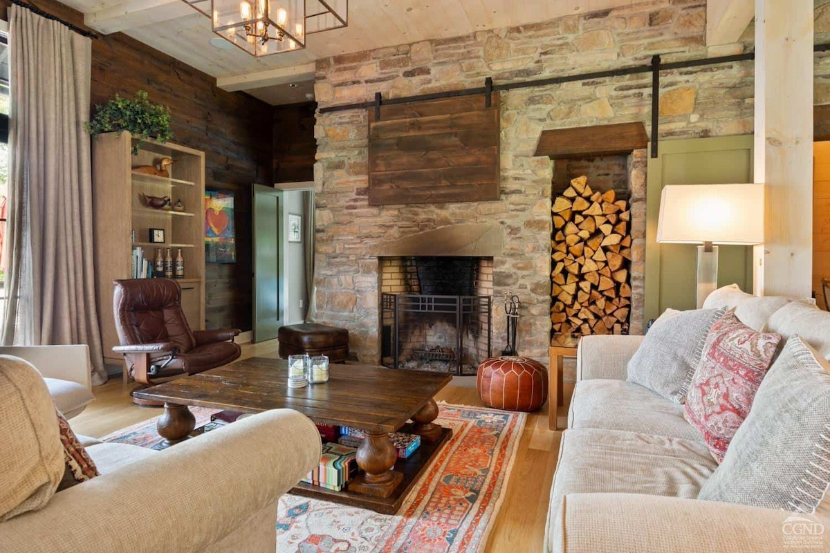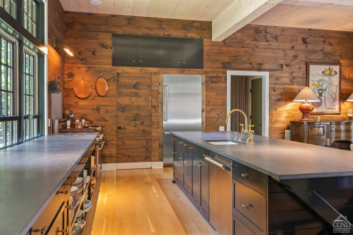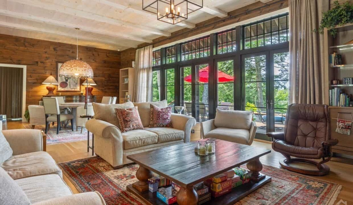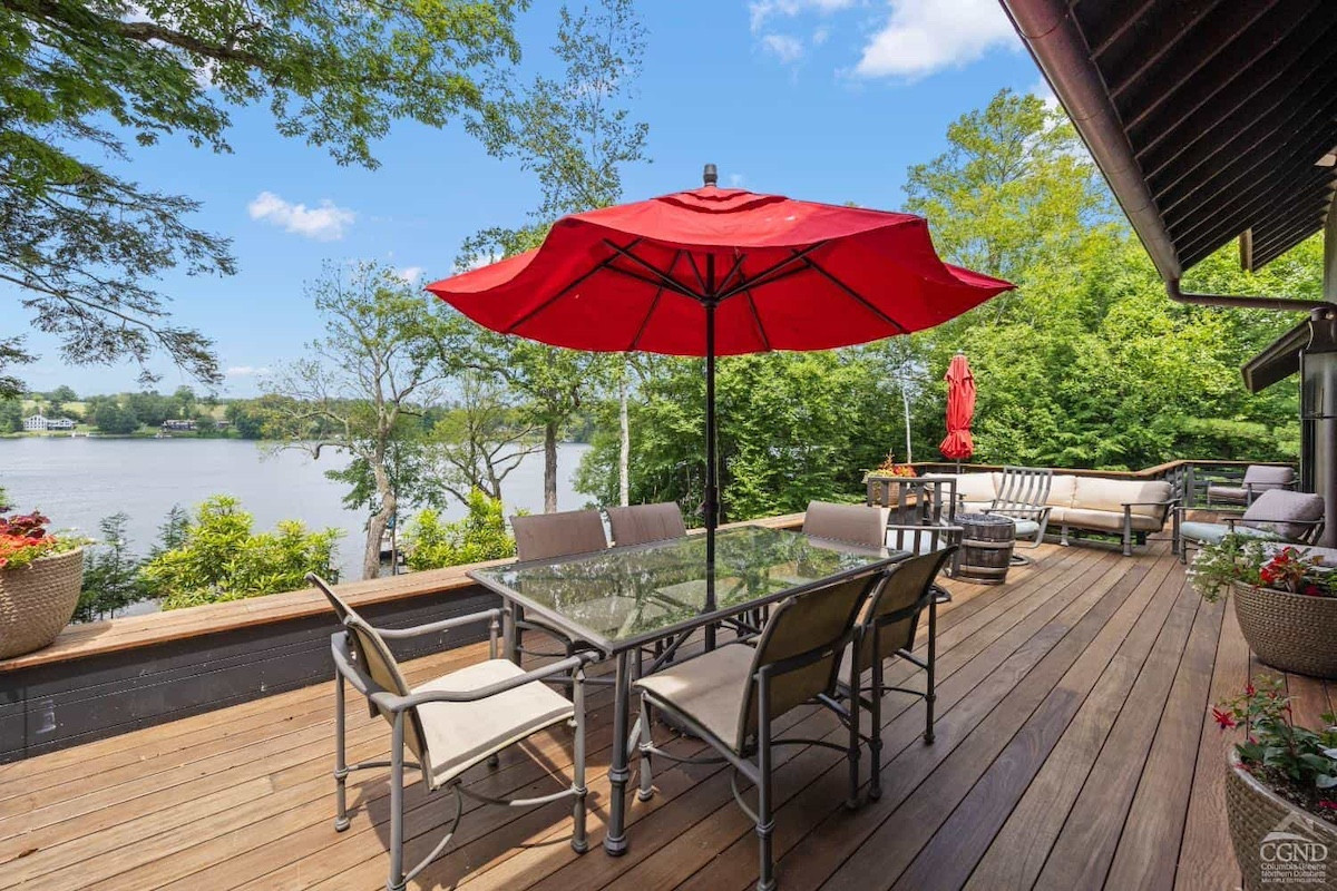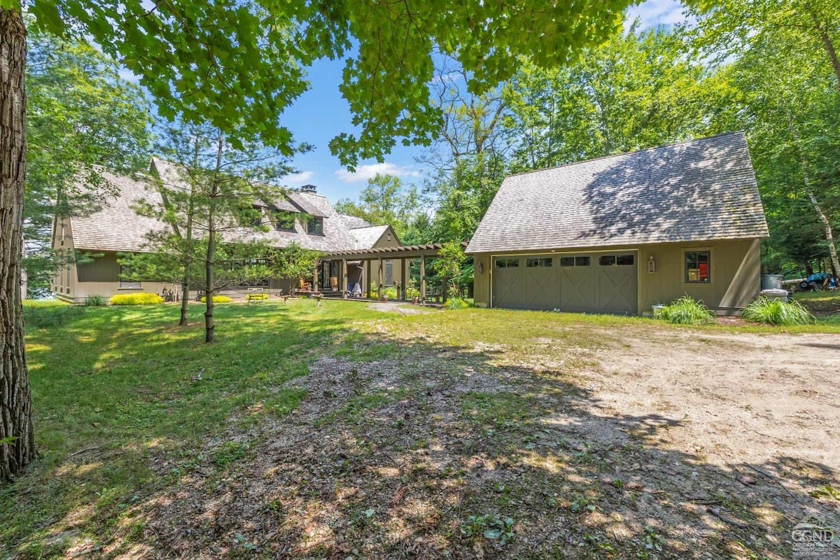 This 5,300-square-foot waterfront home at Copake Lake has five bedrooms and four bathrooms. The great room has a fireplace and wet bar. Exterior details include cedar shingle roofs, copper gutters, dark green siding and a landscape of old-grown forest intertwined with younger trees. There are several outdoor sitting areas. The gated community has a tennis court for island residents. Listed at $3,875,000 by Copake Lake Realty Corp.