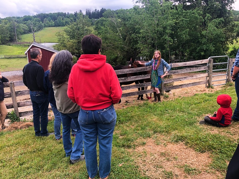 Kindness, care, and compassion were all on display at The Lily Pond Sanctuary in Ghent on Saturday, June 3. Its Earth Day celebration was a fundraiser for the horses, cats, and dogs (52 animals all told) that are now safely ensconced in their forever home. Susan Bandy, who founded the sanctuary in 2015, led guests through a barn and paddock tour, introducing the horses and their back stories, many horrific but ultimately ending with happy tales. “We provide quality care and a lifetime home for senior, special needs cases — animals nobody else wants,” Bandy said. “We get calls to take in horses every day.” After meeting (and feeding peppermints to) the horses, guests regrouped under a tent for hors d’oeuvres and drinks, and a vegetarian dinner. A silent auction and raffle prizes included sessions with an animal communicator and themed baskets of goodies.