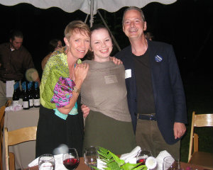 Family bonding at Jacob's Pillow: Ann, Francesca and Joe Gallo of Tyringham; Attorney David Schecker with Vicki Bonnington, sporting a magnificent glass-and-nylon bird sculpture neck piece by Philadelphia artist Emily Cobb, with WAM Theatre's artistic director Kristen van Ginhoven.