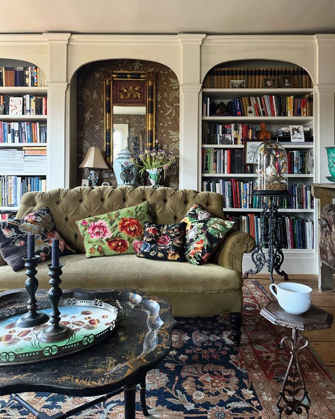 The living room features a pair of 19th-century tufted sofas upholstered in moss green velvet. The bookcases were designed by Coviello, modeled after the Greek revival fireplace mantel millwork original to the house.