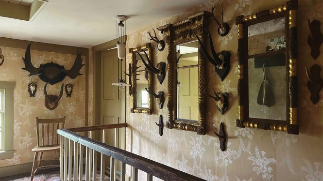 The upstairs stair hall is papered with wallpaper from the 1930s and is hung with a collection of gilded 19th-century American Empire-style mirrors. The vintage mounted horns were collected from Coviello’s travels in Europe and the UK.