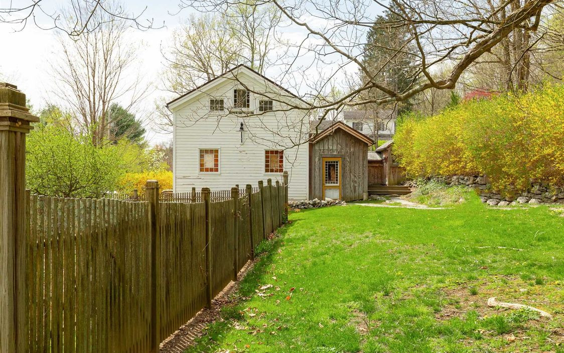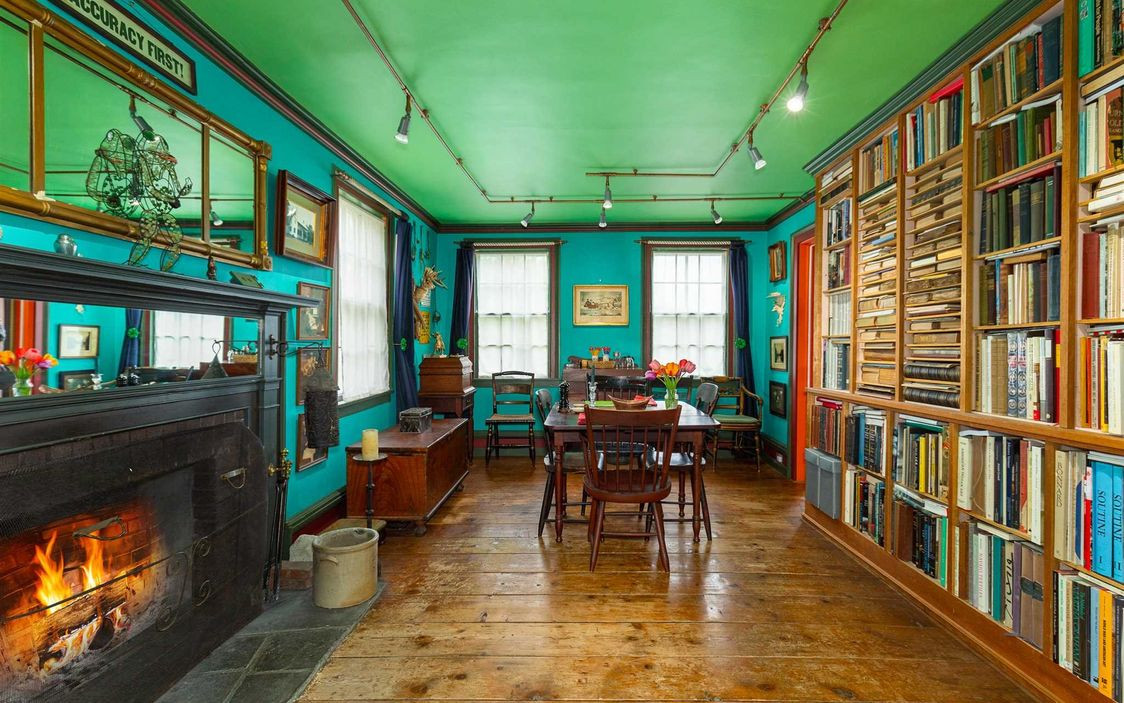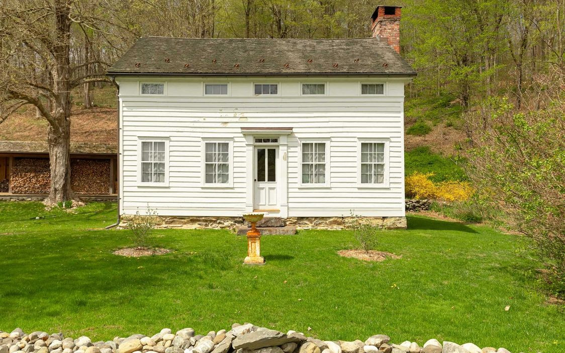 The Greek Revival Colonial in Rhinebeck has its original wide-plank floors, custom built-ins and brick wood-buring fireplace, all restored. There are three bedrooms and two bathrooms. The house sits on 7.6 acres with lawns surrounded by trees, woods, pathrways and a natural pond. The restored barn is now a studio with two levels of work space. Listed at $835,000 by Houlihan Lawrence.