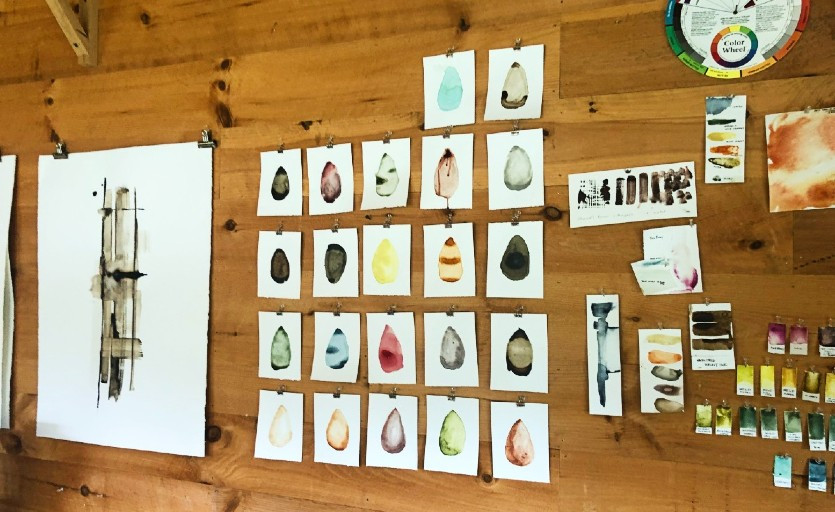 Duffy’s studio is in a sunshine-filled portion of an old dairy barn. It’s filled with countless bottles and jars of an alchemist, and curious tools that she uses in her processing. The walls are lined with color swatches and her own work, which spans from abstract geometric paintings to landscapes, all in beautiful monochromatic palettes.