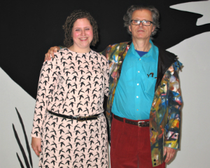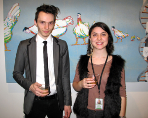 Amy Krzanik reports from North Adams. Wigs, a lamp in the shape of a nose, glowing sculpture under black lights, Dan Quayle (remember him?), Superman’s head on the body of a chicken — all of these items and more are featured in MASS MoCA’s newest exhibition, Jim Shaw: Entertaining Doubts. On Saturday, March 28, the Museum held an opening reception for the artist, who was celebrating his largest U.S. exhibition to date, one that includes a new work made especially for the show. The large-scale banner work, Not Since Superman Died, features the superhero as a mere mortal, possibly unable to escape calamity. The event doubled as a belated reception for Bibliothecaphilia, which opened at the Museum this past January. Shown above, the show's curator, Denise Markonish, with the artist.