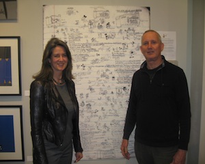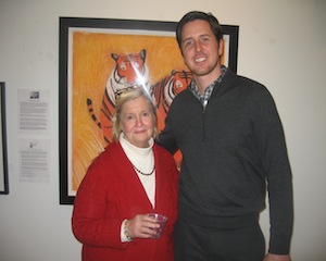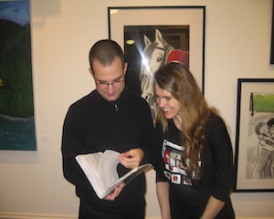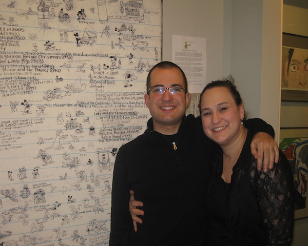 Rachel Louchen reports from Lee. The Good Purpose Gallery certainly is appropriately named. Since its inception two years ago, the mission of the gallery has been to give young adults on the Autism Spectrum the opportunity to share their passions by participating in exhibits, workshops and lectures through the Community Internship Program. On Friday, January 24, the gallery hosted the work of 24-year-old Justin Canha, an artist on the Spectrum from Montclair, New Jersey whose diverse catalog of work such as colorful animal pastels and carnivorous plants will be on view until February 5. The highlight of the exhibit was the large-scale scan of his beloved composition book (which he always carries with him) displaying his stencils of almost every cartoon character imaginable from Wile E. Coyote to Homer Simpson, allowing guests an inside look into the mind of an artist. Canha is the subject of an upcoming documentary, Don't Foil My Plans (which was being filmed that night) that will highlight his journey as he pursues his goals of moving into his own apartment and becoming a well-known illustrator and animator. If his enthusiasm, high spirits and sense of humor are any indication of the future, Justin has a long career ahead of him. Above, Justin Canha with his cousin Afton Pavletic looking over his beloved composition book.