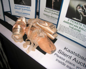 The dance studio transformed for a gala dinner; signed ballet slippers offered at the silent auction.