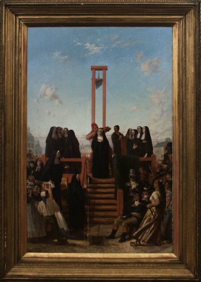 Lot 8: HIPPOLYTE DELAROCHE (1797-1856): THE GUILLOTINE There are many exquisite paintings in the collection but none are more arresting than this depiction of a nun before the guillotine, acquired from the Nashville Museum of Art. It may not be to everyone’s taste, or the most valuable piece at auction (it's unsigned), but it vividly depicts the 1794 guillotine deaths of the Martyrs of Compiegne, the 16 Carmelite nuns who were sentenced to death during the Reign of Terror. During the anti-clericalism of the French Revolution, the nuns refused to obey the mandate that suppressed their monastery. They were arrested, imprisoned and brought to Paris where they were condemned as traitors and sentenced to death. On July 17, 1794, all 16 nuns were guillotined. The novice, Sister Constance, was the first to die, followed by the lay sisters and ending with the prioress, Mother Teresa of St. Augustine. Estimate: $1,500-$2,500